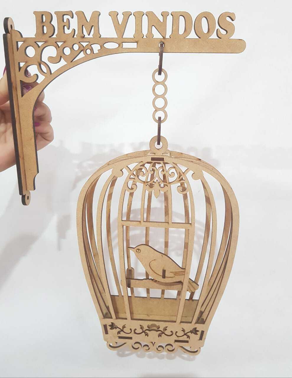 Design: Gaiola vazada 3D com pássaro e arabesco, com a escrita "Bem Vindo" vazada